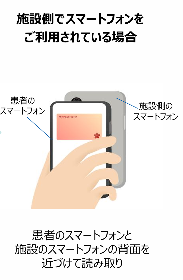 「患者さまのスマートフォン」と「施設側のスマートフォン」の背面を近づけて読み取り
