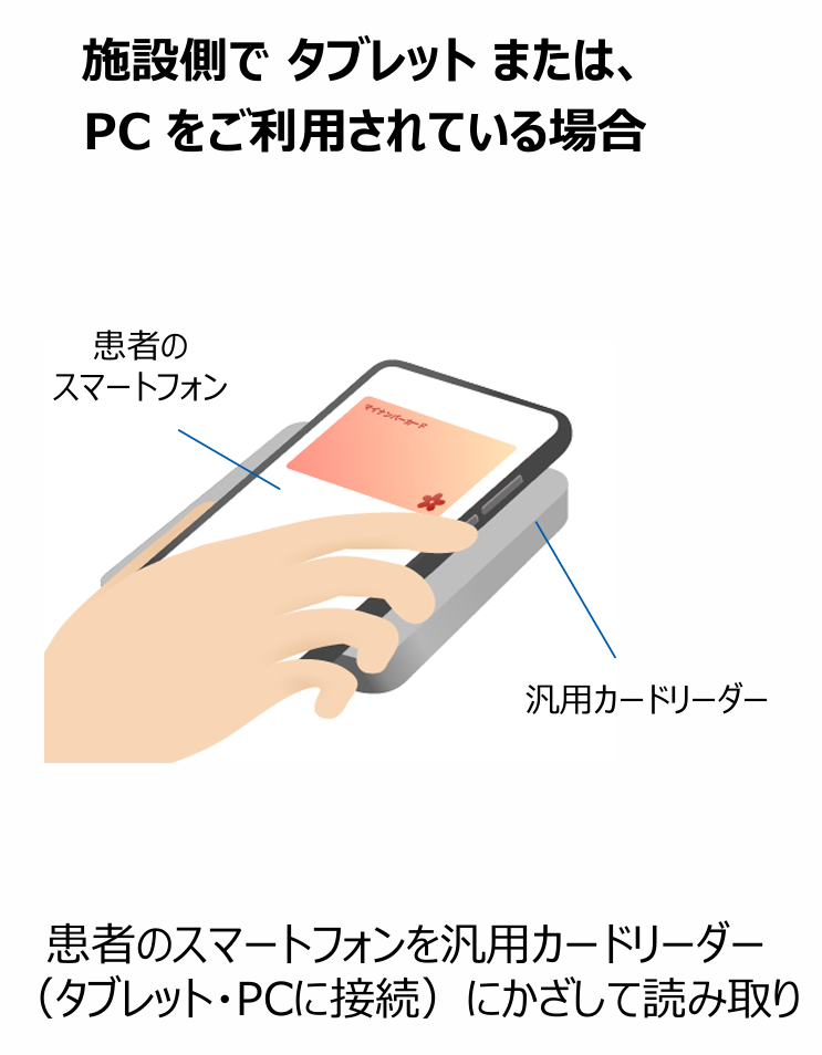 「患者様のスマートフォン」を「汎用カードリーダー」にかざして読み取り
